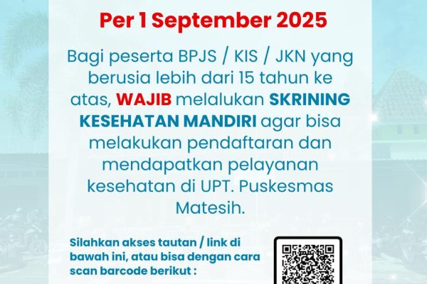 UPT. Puskesmas Matesih melayani masyarakat dengan pendekatan integrasi primer. Dengan motto "Anda Sehat Kami Bahagia", kami berkomitmen memberikan pelayanan holistik untuk meningkatkan kesehatan dan kesejahteraan masyarakat.